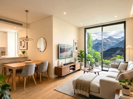 Scenic Living Space: Thoughtfully designed interiors with large windows that frame panoramic mountain views, complemented by warm finishes and a cozy ambiance—creating a perfect blend of comfort and nature-inspired living.